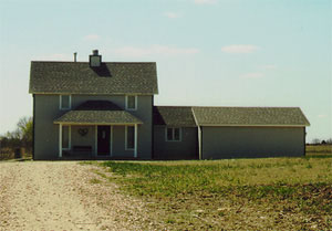 The 4-over-4 original dwelling is clearly visible in this photo of a home relocated from Brainerd to a lot one mile northeast of town. A narrow, single-story addition and covered entryway appear to have been added after the house arrived at its destination, and the entire frame was reinforced, painted and re-roofed.
