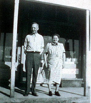 In this photo, taken in 1942, owners Oscar and Maggie Hershey pose on the store's front porch, facing Broadway. Note the absence of a sidewalk separating the porch from the sandy dirt street.